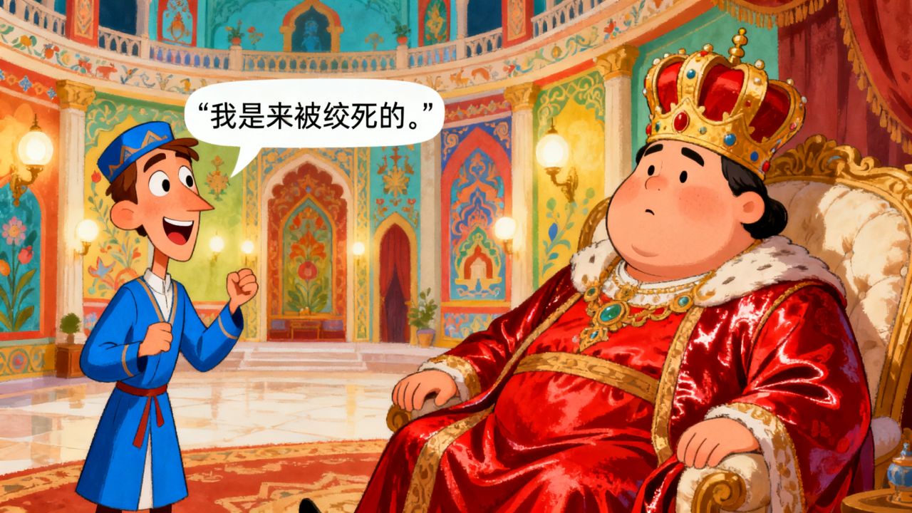 某天,有个旅游者来到这个国家,回答上述问题时他答道:“我是来被绞死的。”如果旅游者回答是对的,按照法律,他就不应该被绞死;如果旅游者回答是错的,按照法律应被绞死,而他的“我是来被绞死的。”这句话显然又是回答对了,也不应该被绞死。最后,国王无可奈何,只得对旅游者放行。