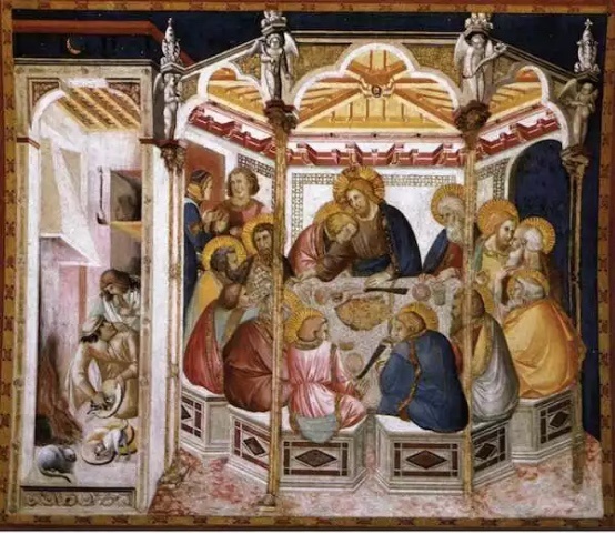 在 Pietro Lorenzetti 的《最后的晚餐》中,一只哈基米坐在火边,一只小狗舔着地上的一盘剩菜。 猫狗在场景中没有扮演叙事角色,而是向观众发出信号,表明这是一个家庭空间。