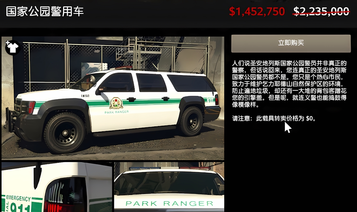 購買:[國家公園警車],立即獲得“冬季公園警察制服”(長袖領帶款),已購買擁有的玩家72h內到賬(次世代《增強版》內容)