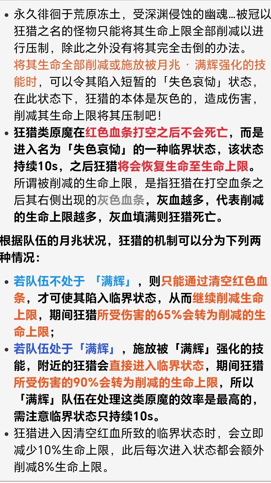 1.怪物具有2管血,第1管是人類,第2管是狂獵。人類生命值爲0後進入持續4s的臨界狀態,並轉爲狂獵怪,具有狂獵怪的所有機制。(即4s後回覆生命值至新的生命值上限,並轉爲狂獵)。