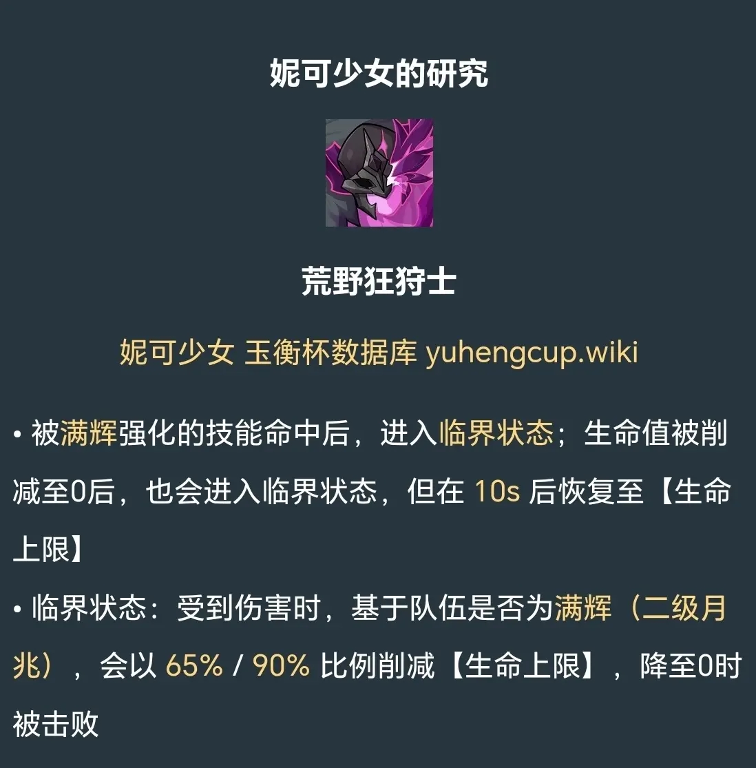 2.當怪物被已被滿輝強化的技能命中後或生命值爲0後進入臨界狀態,持續10s。(經實戰,愛諾Q在滿輝時僅在第1下時進入臨界狀態,後續Q的所有攻擊不刷新臨界狀態持續時間。)