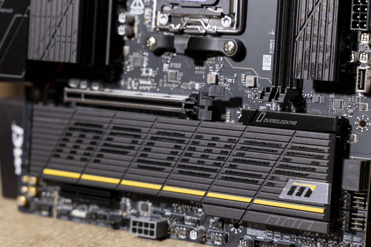主板散熱方面採用了擴展型 VRM 散熱片設計,碩大的 VRM 散熱裝甲十分醒目,若隱若現的MSI龍紋格外亮眼。散熱片底部採用分段式多層疊加的鰭片設計,並輔以 7W/mk 的高效能導熱貼,大大增加了散熱面積,提升了散熱效率。