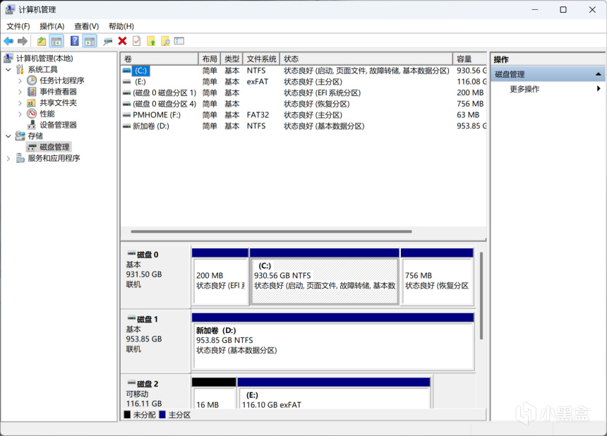 你就能看到你安装的新固态硬盘了,上面会显示未分配的状态,我这个已经使用很久了,已经分过区了,