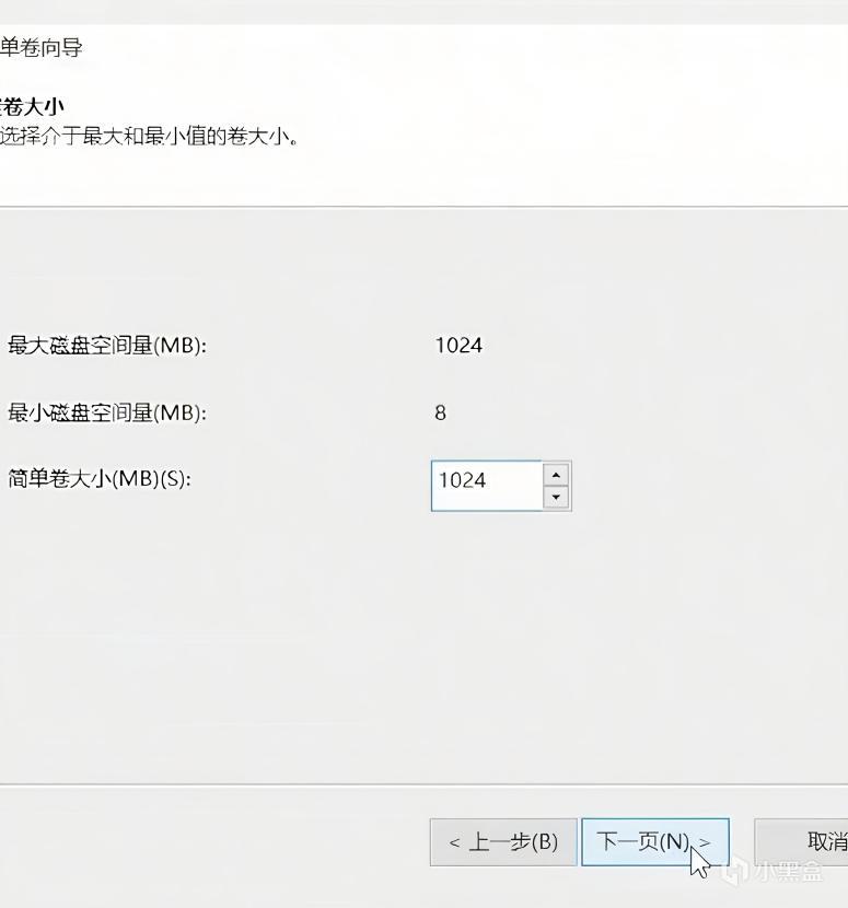 这里让你设置这个卷的容量,按你自己需求设置即可,或者学我直接默认一整个盘为一个区,