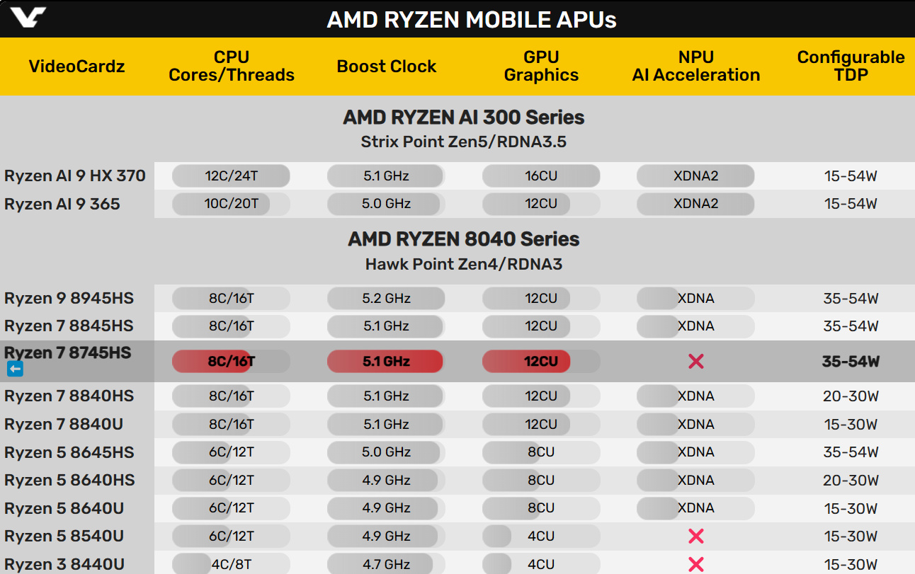 这枚CPU于24年7月发布,当时Zen5架构的AI 300系列都快上市了。它与8845HS类似,核显都是12CU,倒是NPU模块被砍掉了,不怎么影响日常办公娱乐的同时,价格的确是下来了。