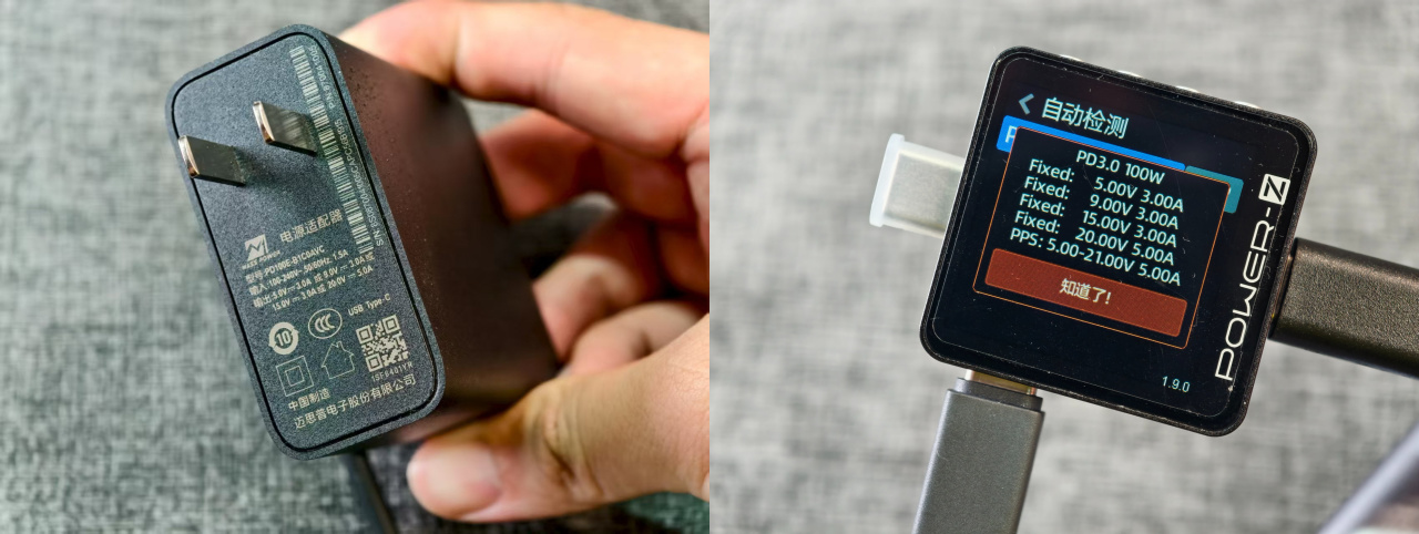 整个包装含主机一台、100W PD适配器(双脚插头)和说明书,应对最大65W核功耗的8745HS绰绰有余。协议比较简单,用来给其它笔记本充电没问题,也支持PPS。