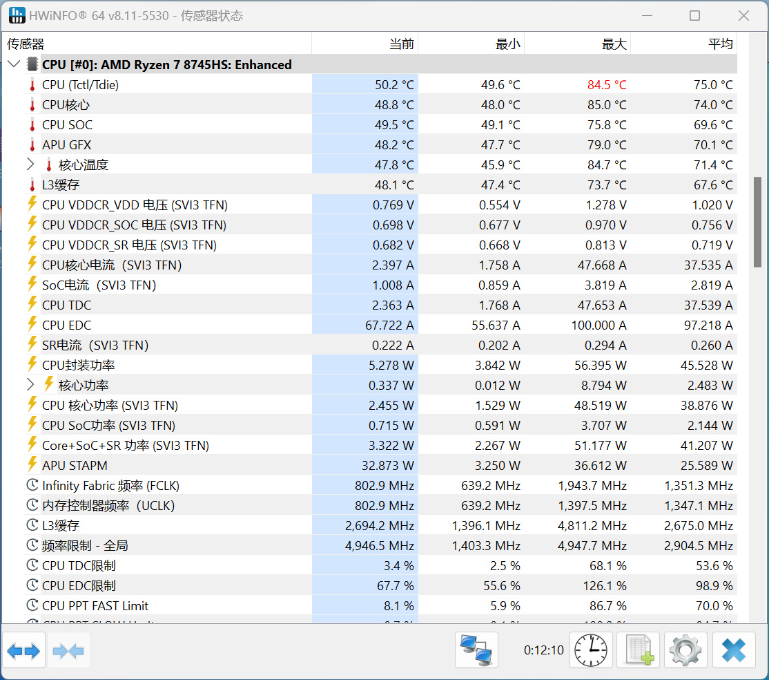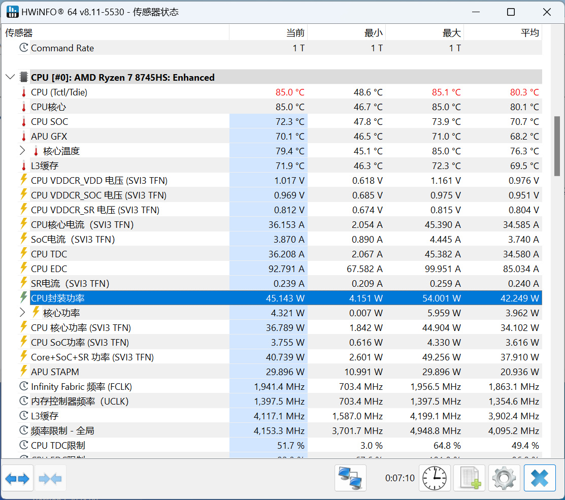 CPU最高温度为85℃,对于mini PC和笔记本而言,算是正常温度。