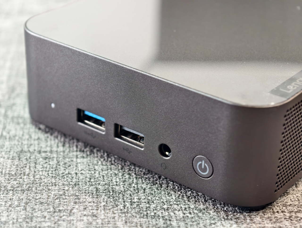 机器正前方是一个10Gbps的USB-A和一个2.0规格的USB-A,以及耳麦孔。电源键的图标不会亮起,以右侧的指示灯灯为准。