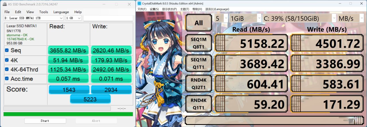 AS SSD/CDM测试如下图所示,非常标准的中速PCIe4.0固态,空盘顺序读写为5.1GB/s读取,4.5GB/s写入,速率比较理想,50MB/S的4K随机也还算说的过去。