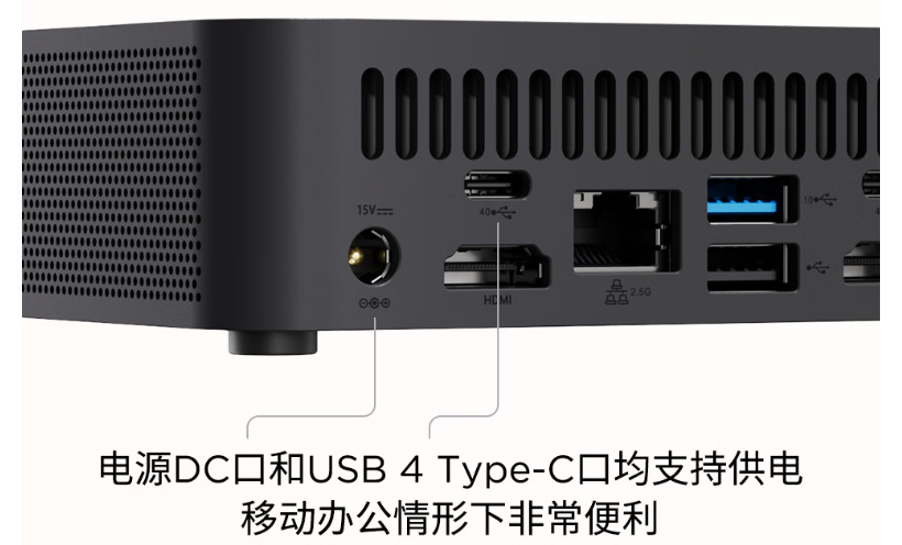 扩展丰富,适用性强。这算是小主机的强项,甚至还是OClink接口的,但百应这款更实际,2C(40Gbps)+4A的组合,还支持C口/DC两种供电模式,外接多少设备都没问题。