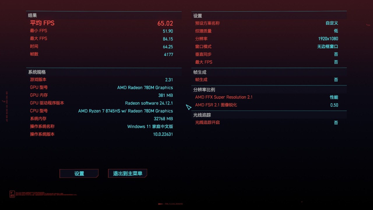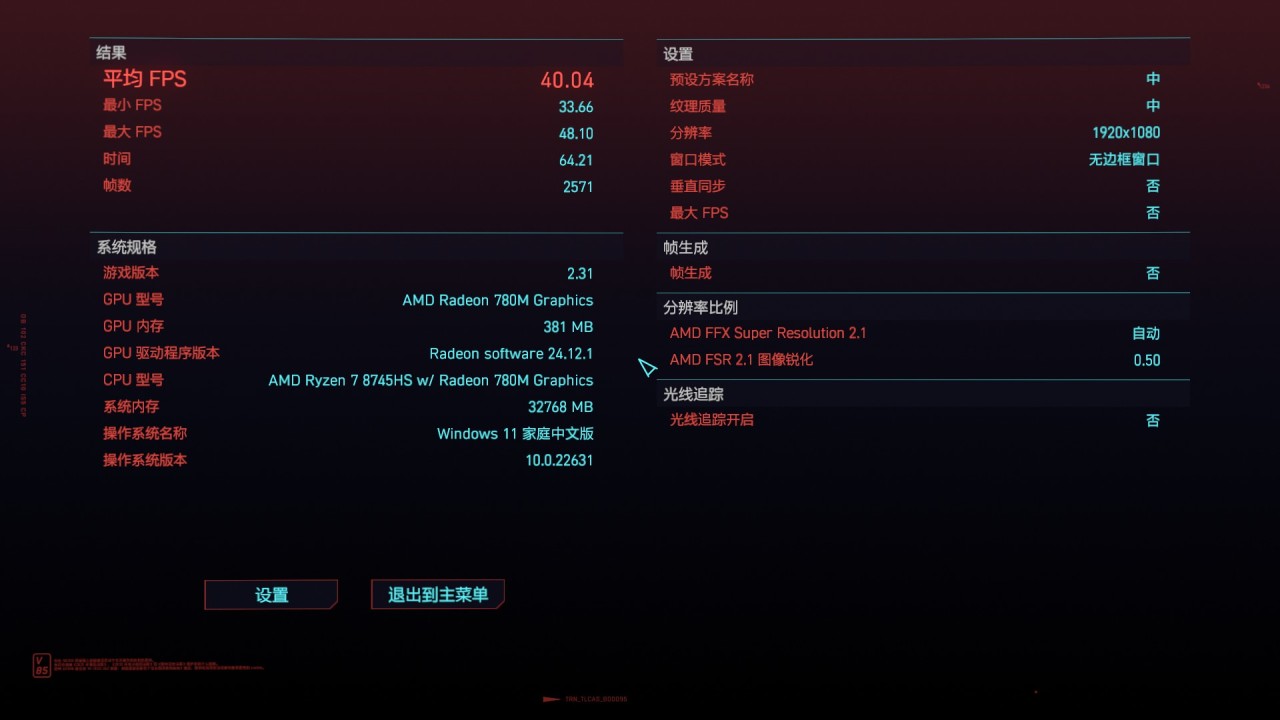 780M的核显性能很强,但总归还是核显,这里主要以《赛博朋克2077》和《CS2》分别测试其3A和网游性能,仅供参考。