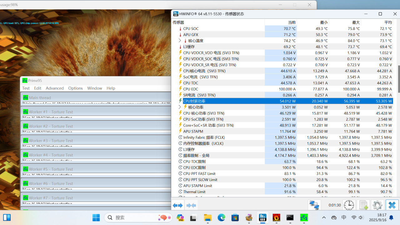 性能模式(54W)下,双烤CPU稳定在54W释放,控制十分精准,峰值能到56W,此时适配器插线板功率已经达到98W,这时电源部分还是有些瓶颈。
