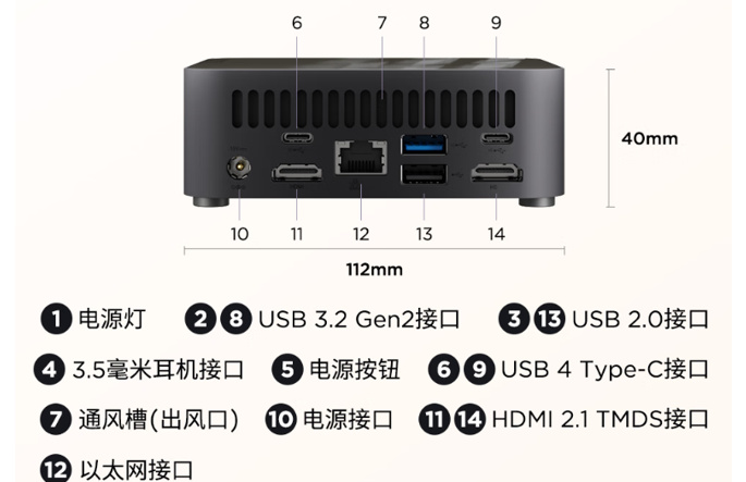 背面有两个HDMI 2.1,两个USB-C(40Gbps)、两个USB-A,以及一个2.5G网口。扩展性直接拉满,外接各类外设接收器的同时,还能够通过高速USB-C口接拓展坞,或者硬盘盒。
