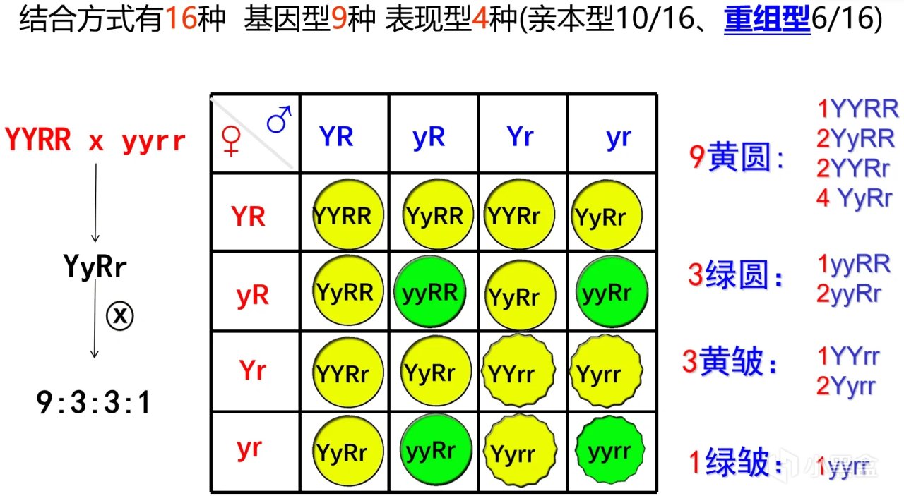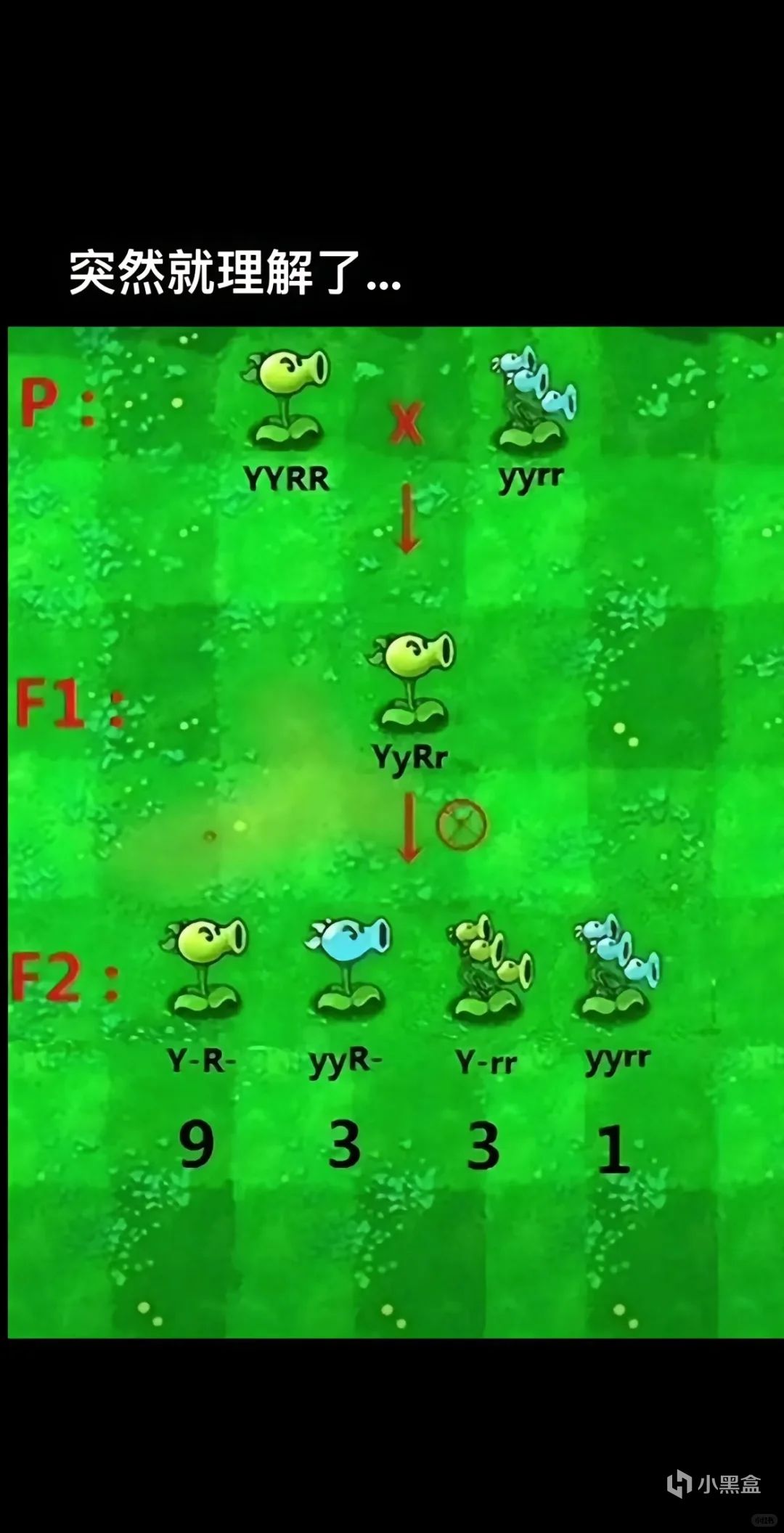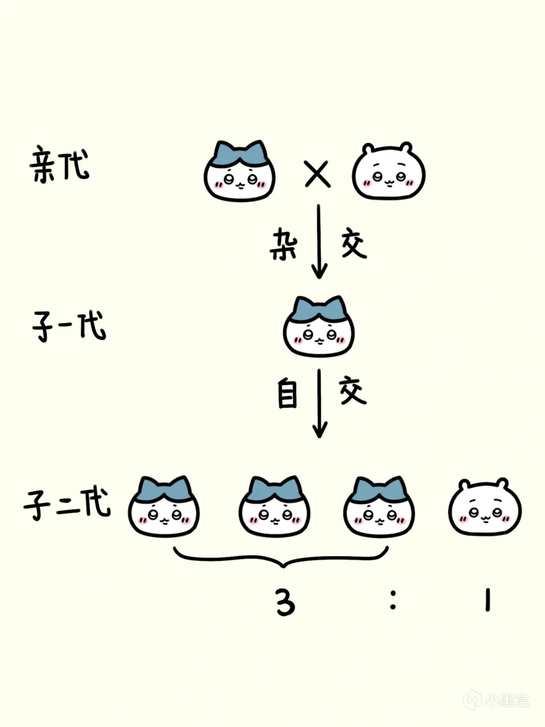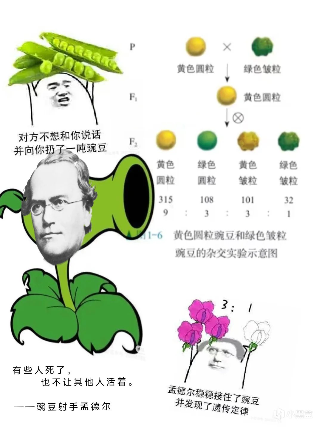 他發現,將黃色種子的豌豆植株與綠色種子的豌豆植株雜交後,第一代後代均爲黃色種子;而到了第二代,綠色種子與黃色種子的比例爲 1∶3 。