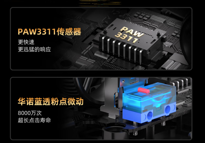 這一款的傳感器是PAW3311,微動使用的是8000w次點擊壽命的華諾藍透粉點確認感很強,在這個價位來看配置已經很不錯了