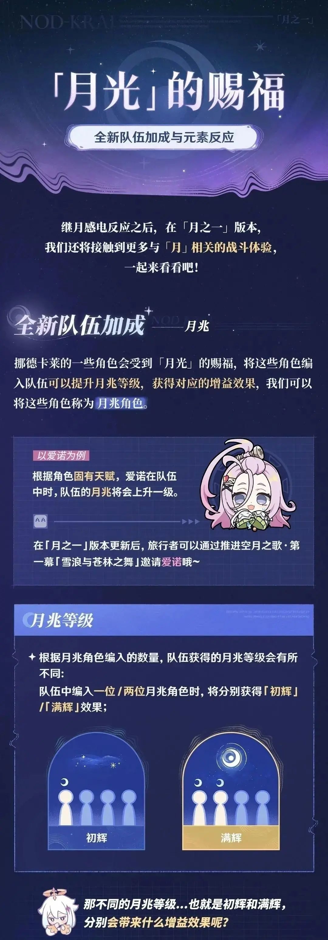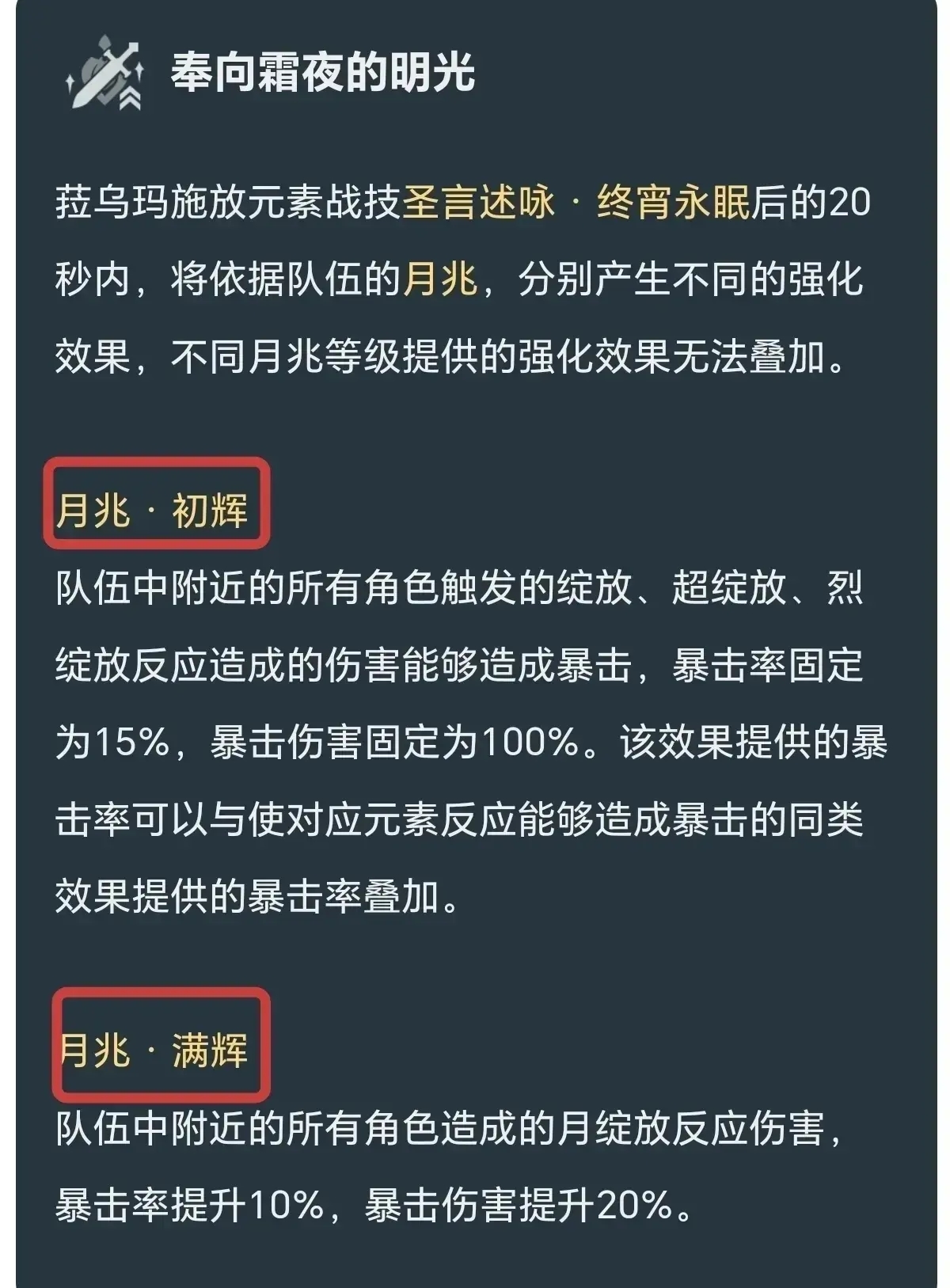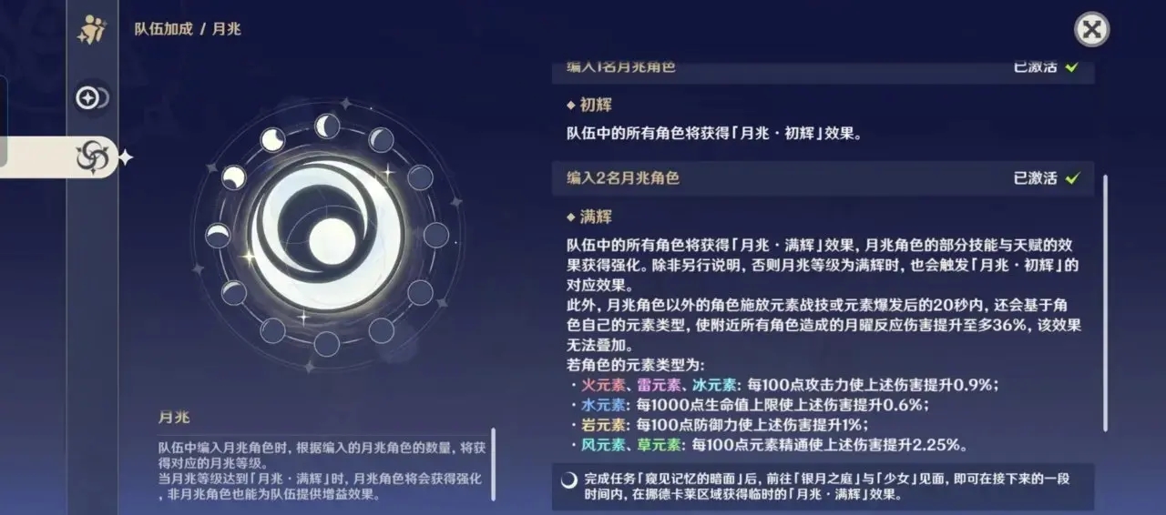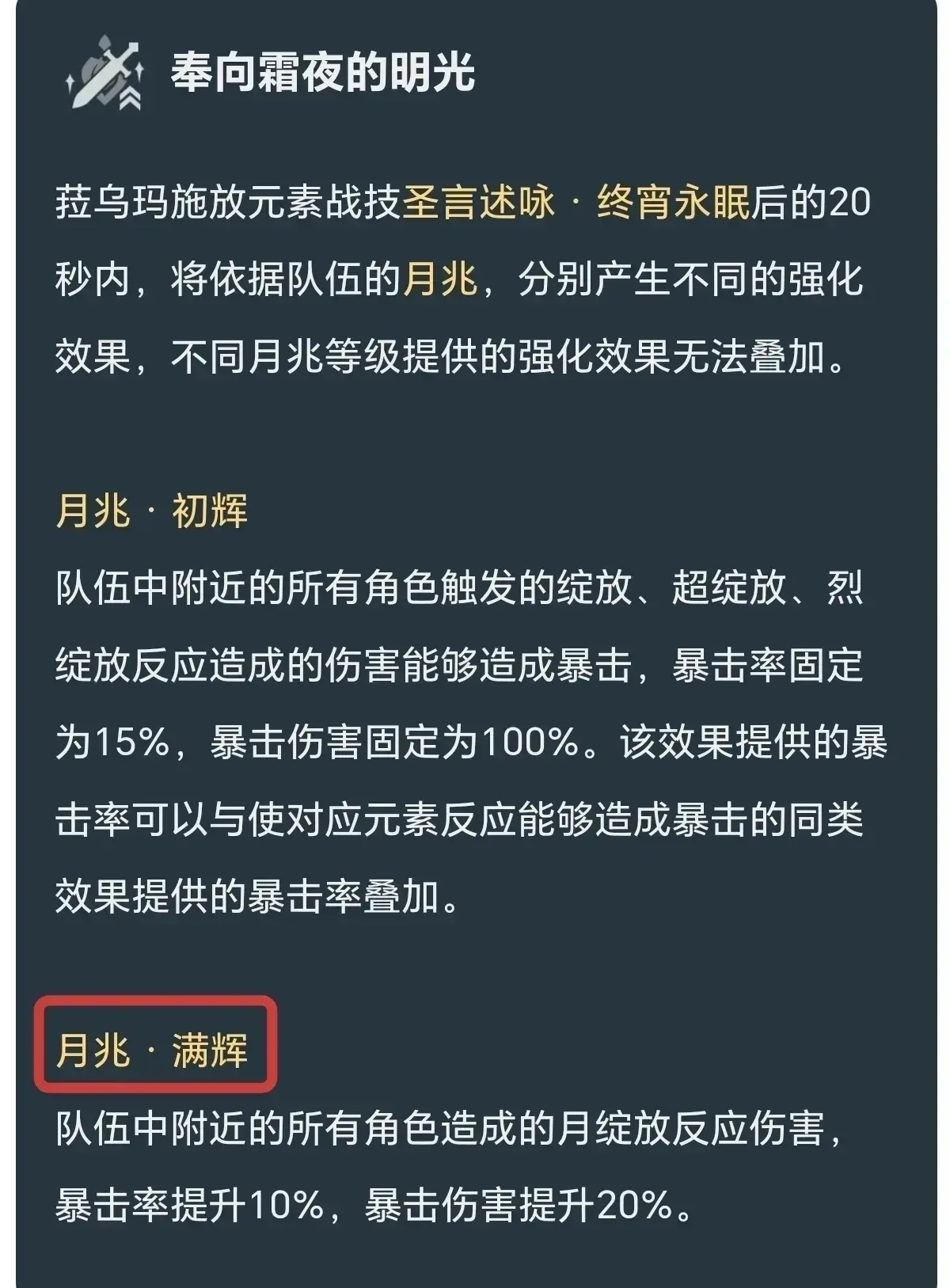 4.满辉状态下的队伍有额外的月反应增伤,上限为36%,由非月兆角色释放E或Q提供。(此为伤害计算中的“精通区”加成,所以其实没有多少)
