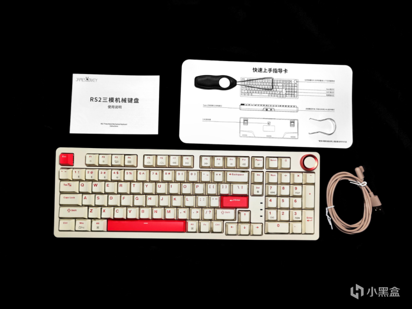 除了鍵盤之外,還有USB Type-A to Type-C數據線、說明書和快速上手指導卡、拔軸器、拔鍵器,沒有替換鍵帽高情商就是環保。