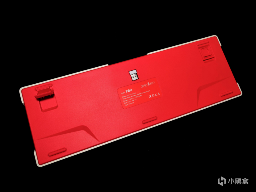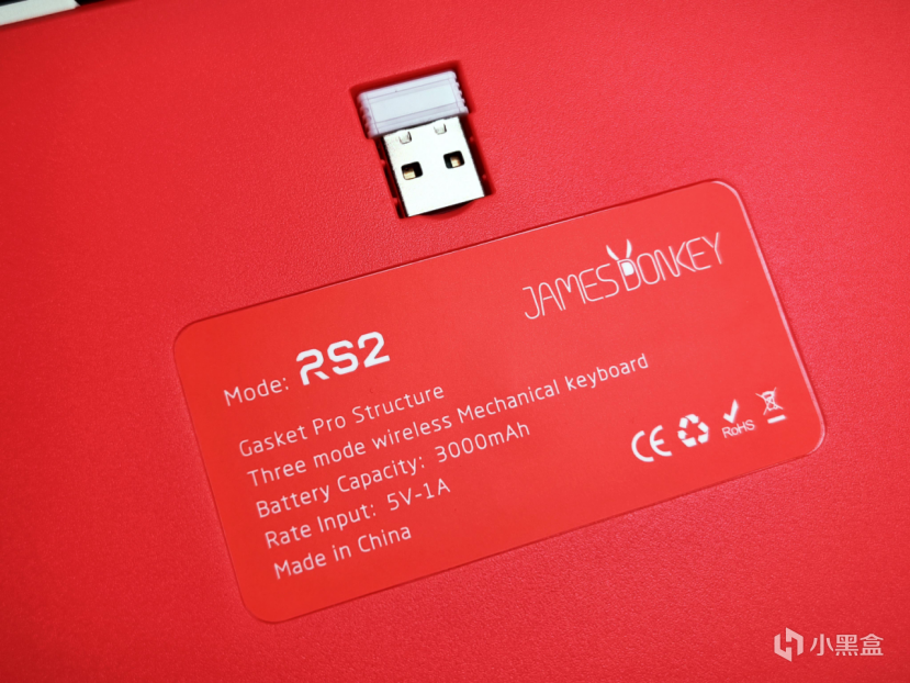 正面左側豎直標註了型號RS2,中間簡筆畫勾勒出RS2的輪廓,正面前側英文標註了產品名稱,右下角標註GASKET PRO結構、三模無線連接的特性。右上角和前側面都有賤驢“James Donkey”的Logo。