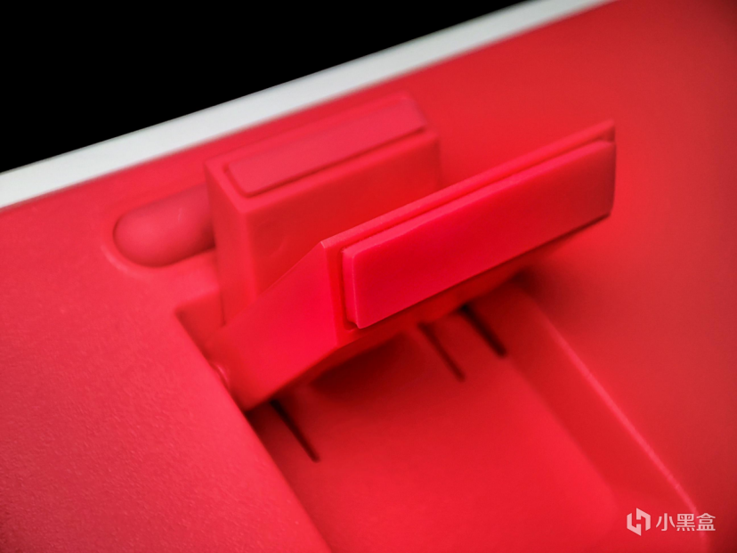 左右側面的下方中間位置,凹進去位置鏤空漏出了底部外殼,又是一抹桃紅色碰撞,角度和鍵盤的傾斜角度保持了水平。