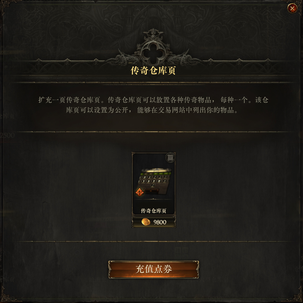 传奇仓库页的售价还是蛮贵的9800点券,可以放所有的传奇装备,不过每种只能一个,不过游戏传奇装备只有很少一部分会用到,这个仓库页更多是收集使用,没有收集癖好完全不用理会。