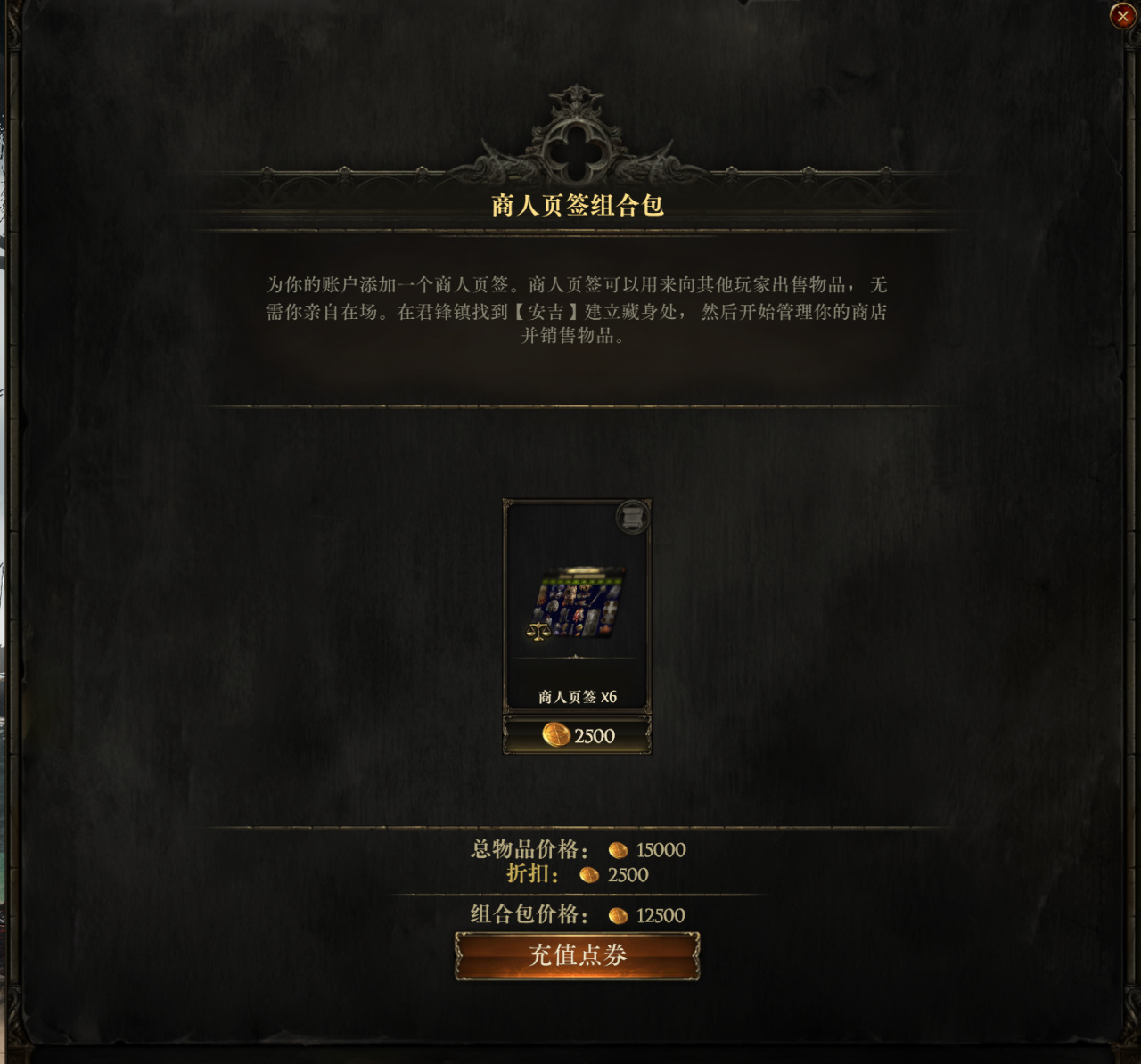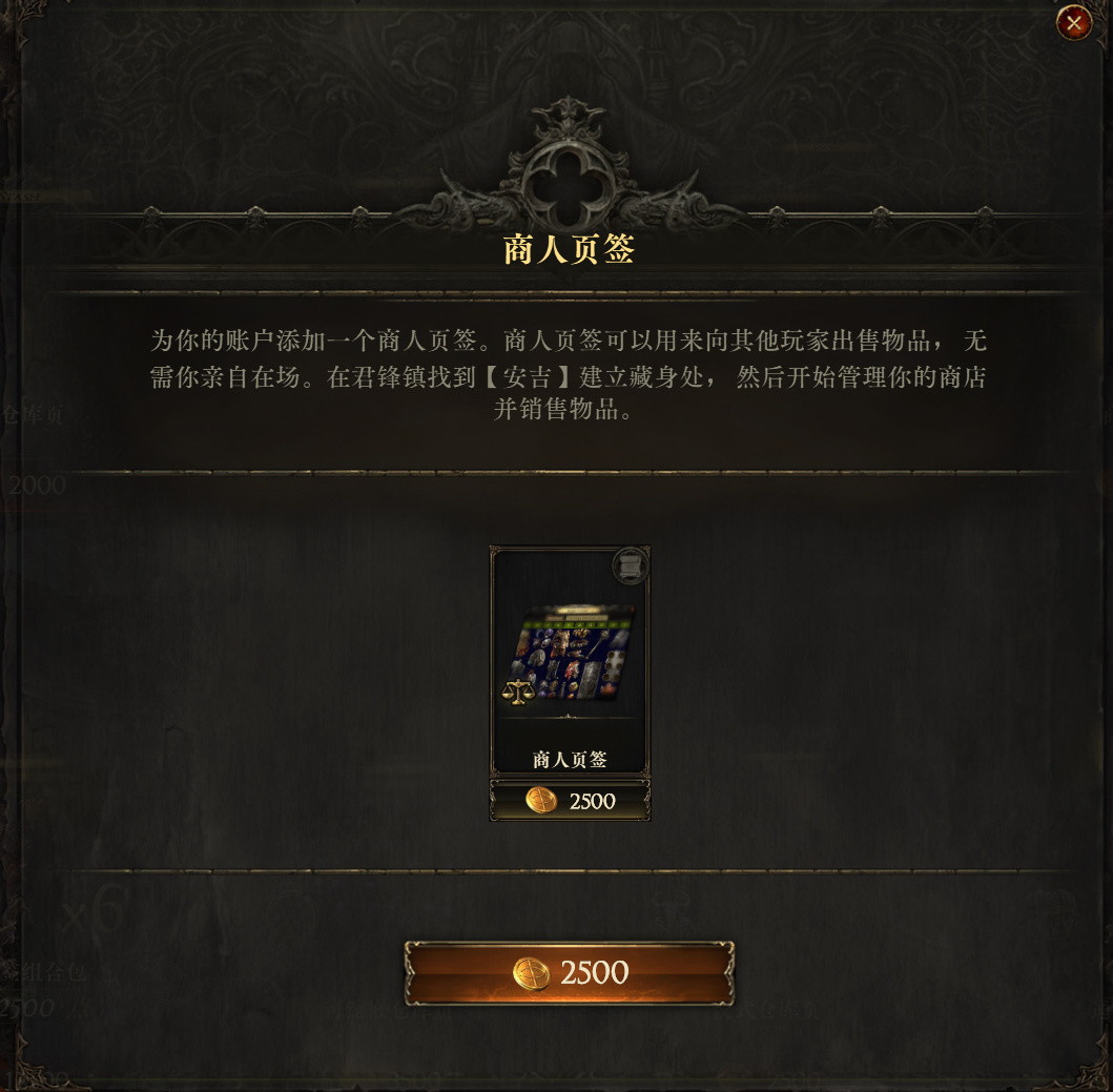价格是2500点券,商人页签的作用就是让我们卖东西,优秀的装备底材和极品毕业装备都可以通过这个卖给其他玩家,这也是游戏经济的运营主旋律,必买仓库。不过这个商人页签只有到第四章完成安吉藏身处任务之后才能使用,前期用不了,可以不着急买。