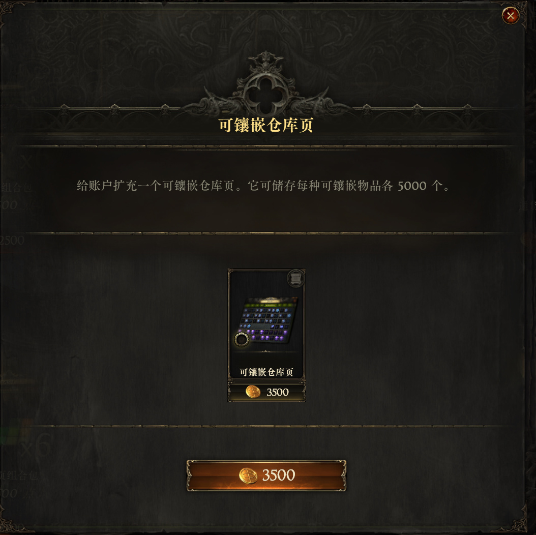 可镶嵌仓库页价格是3500点券,用于符文存放,符文的种类非常多,后期掉落数量也很夸张,加上毕业装备都是需要打孔镶嵌对应符文的,有了这个页签可以快速找到对应的符文,不用每次都去仓库挨着找,小二推荐大家还是买一个。
