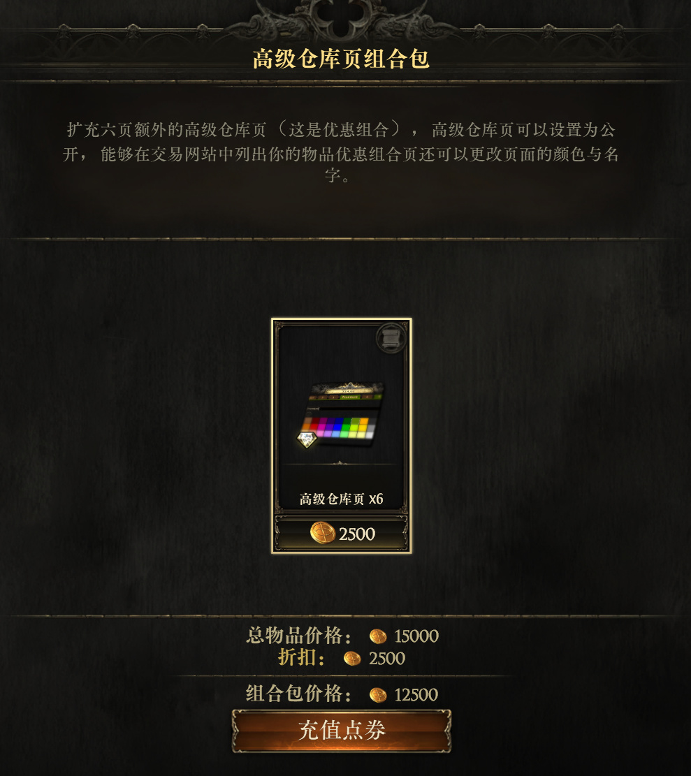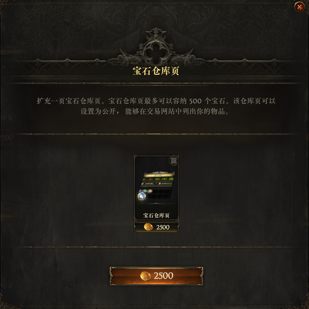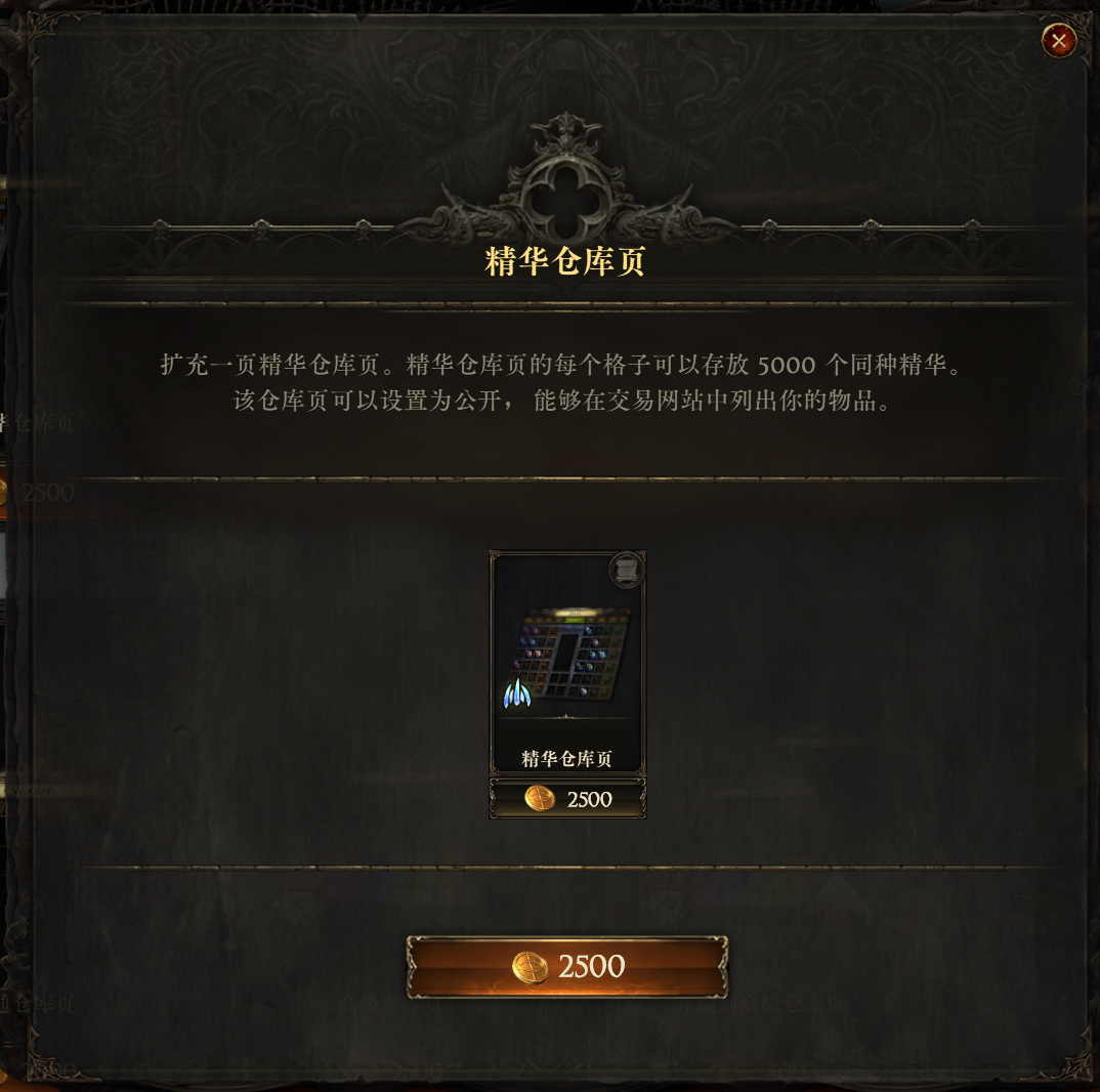 精华仓库页售价2500点券,游戏里面想要给装备打固定词缀就需要用到精华,流放之路二游戏词缀种类还是很多的,单买一个专门放精华的仓库页,能够减少整理和查找的时间,有条件还是可以安排一下。