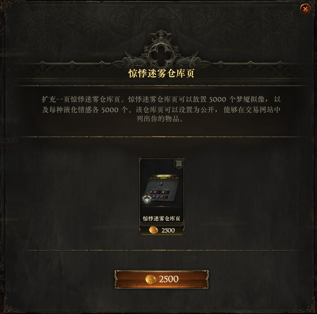 售价2500点券,主要作用是存放梦魇拟像和各种液化情感,目前种类不是很多,这个仓库普通玩家作用不是很大,可以不用购买,想专刷迷雾当商人可以购买。