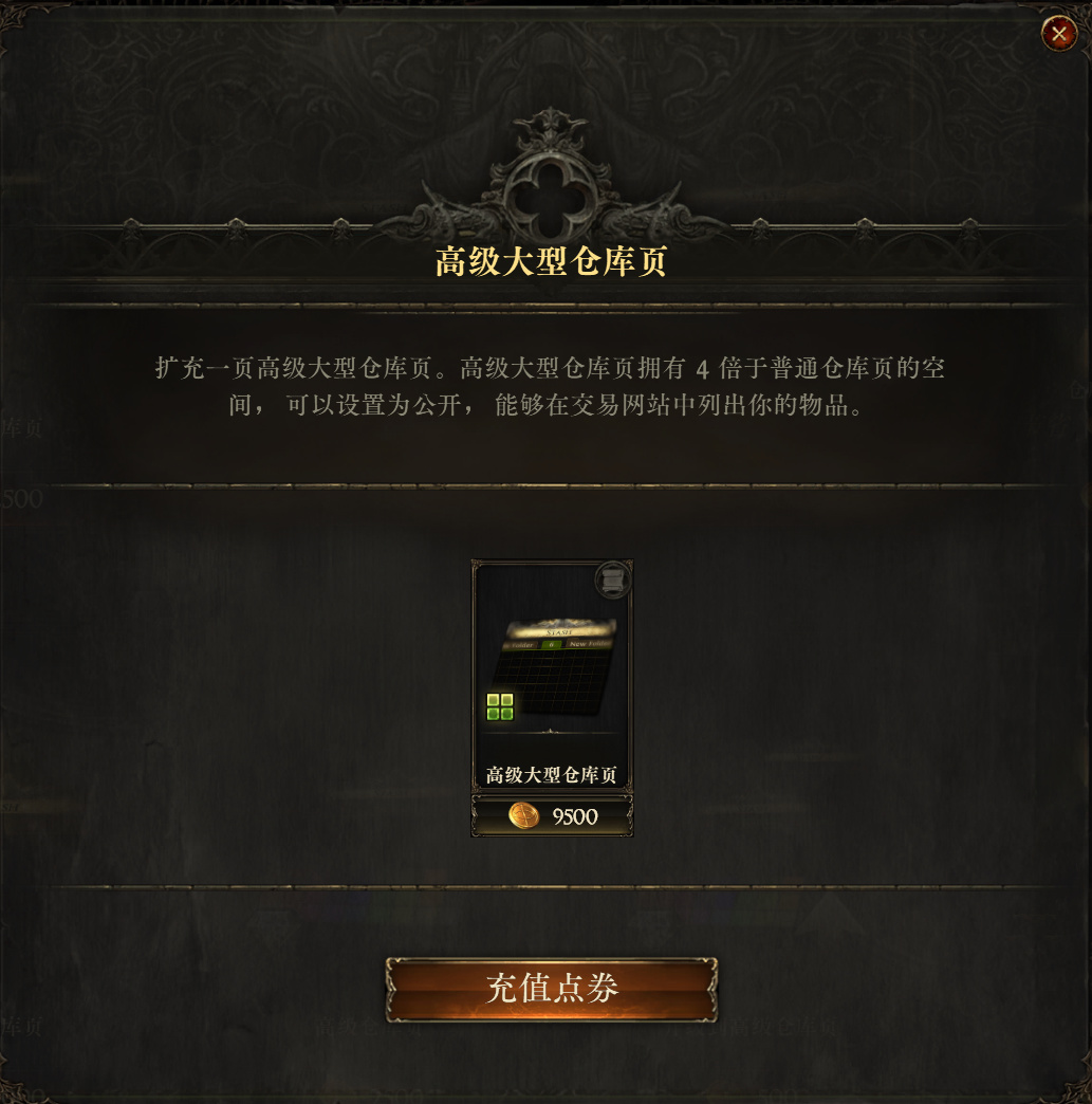 普通仓库页是2000点券一个,购买6连组合包可以节省2200点券,高级大型仓库页售价9500点券。这两功能其实是一样的,简单的存放东西,只是高级大型仓库页格子从144格变为576格子,个人不是很推荐。