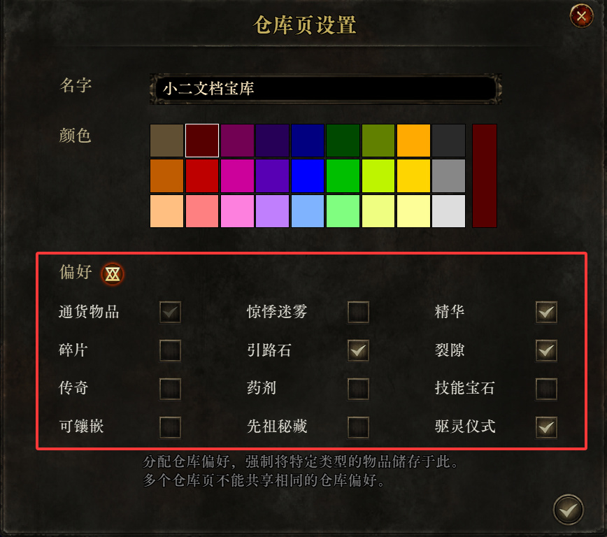 仓库偏好简单来说就是自动归类预设,比如小二这一页仓库页,勾选了引路石、精华、裂隙和驱灵仪式,在放置物品时,系统就会自动把这四类东西强制放到这个仓库。