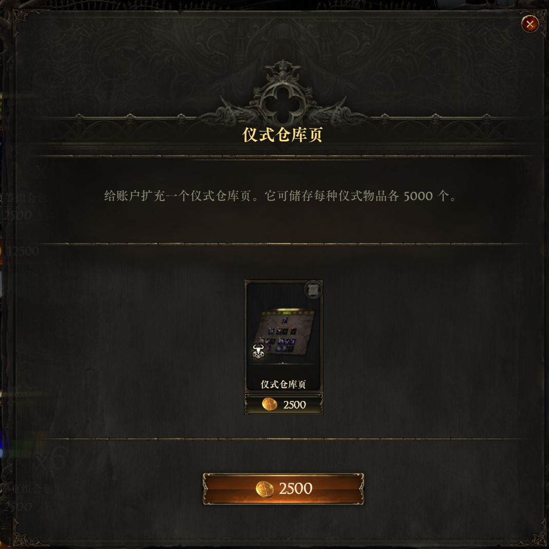 仪式仓库页价格是2500点券,存放打造装备需要的各种仪式物品,新手前中期制作装备都是摸索阶段,很难达到资深玩家的游戏理解,建议放到后面完全熟悉做装套路之后再买也来得及。平时掉落的仪式可以直接放前面的通用仓库,实在放不下了直接换成通货也无伤大雅。