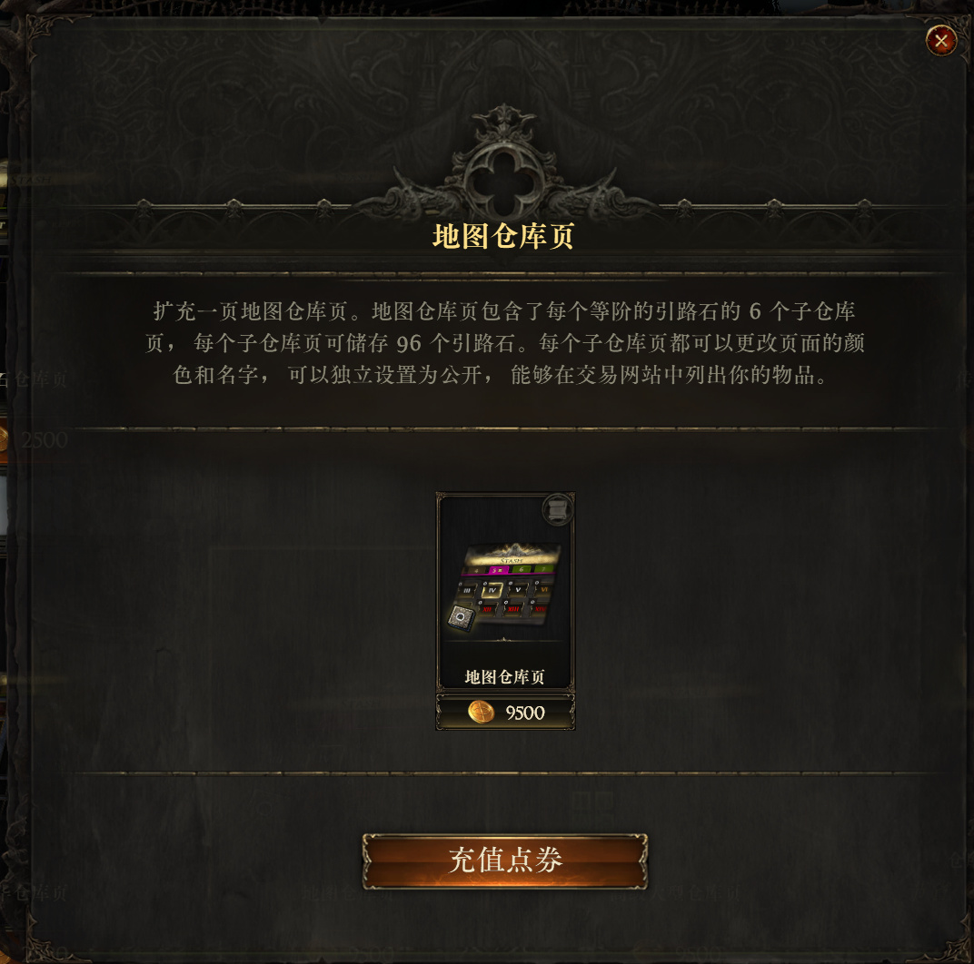 地图仓库页售价是9500点券,主要作用是存放异界的地图门票,游戏中叫引路石。因为初到异界是从一级地图(T1)开始打的,不断升高地图等级,最终我们会来到16级地图(T16),这也是目前游戏的终局玩法。