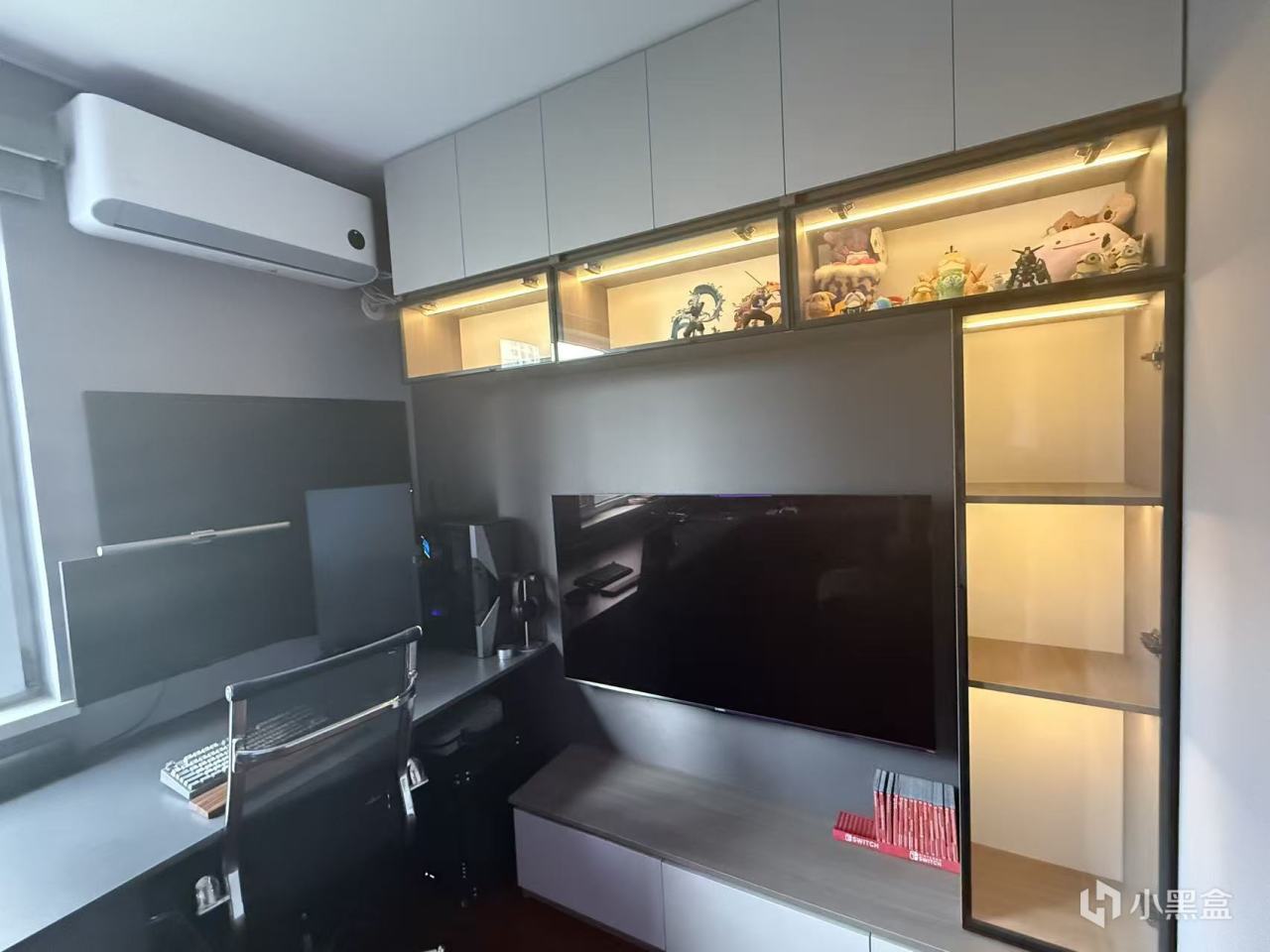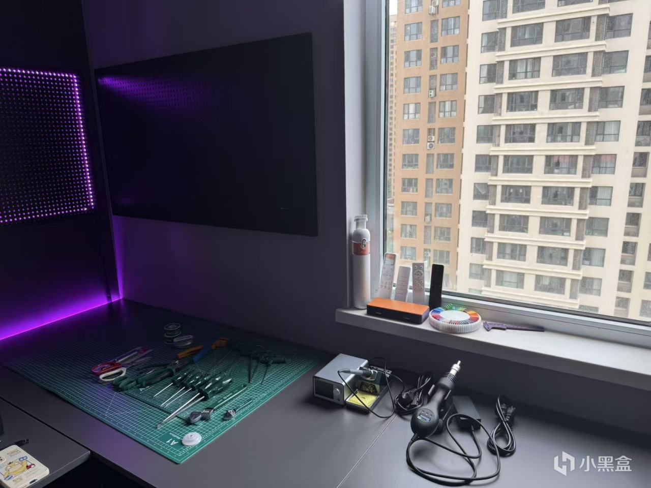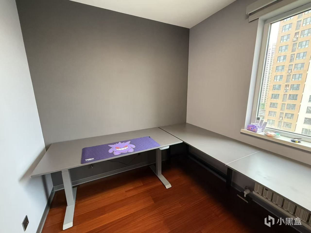 和第一篇筆記https://www.xiaoheihe.cn/app/bbs/link/159283160 裏面提到的一樣,主包的設計是頂着兩面牆的L型的大桌子,左側牆短的那條邊是升降桌用來當主工作區,靠窗牆長的那條邊是固定高度的桌子用來做手工和當副工作區。整個L型桌子的面板顏色都選用的深灰色,基本和我深色的牆布保持一致。