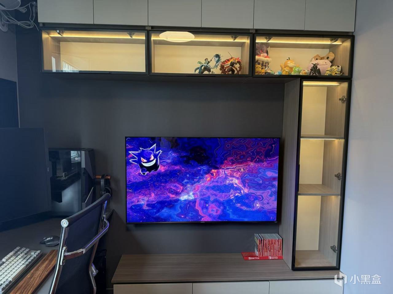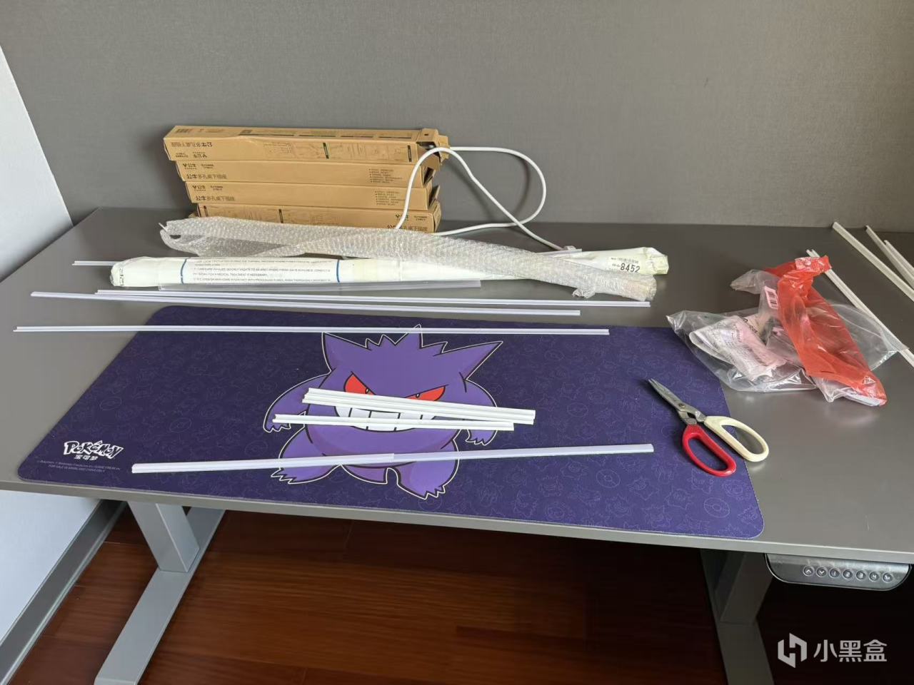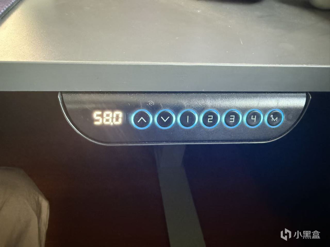 和第一篇筆記https://www.xiaoheihe.cn/app/bbs/link/159283160 裏面提到的一樣,主包的設計是頂着兩面牆的L型的大桌子,左側牆短的那條邊是升降桌用來當主工作區,靠窗牆長的那條邊是固定高度的桌子用來做手工和當副工作區。整個L型桌子的面板顏色都選用的深灰色,基本和我深色的牆布保持一致。