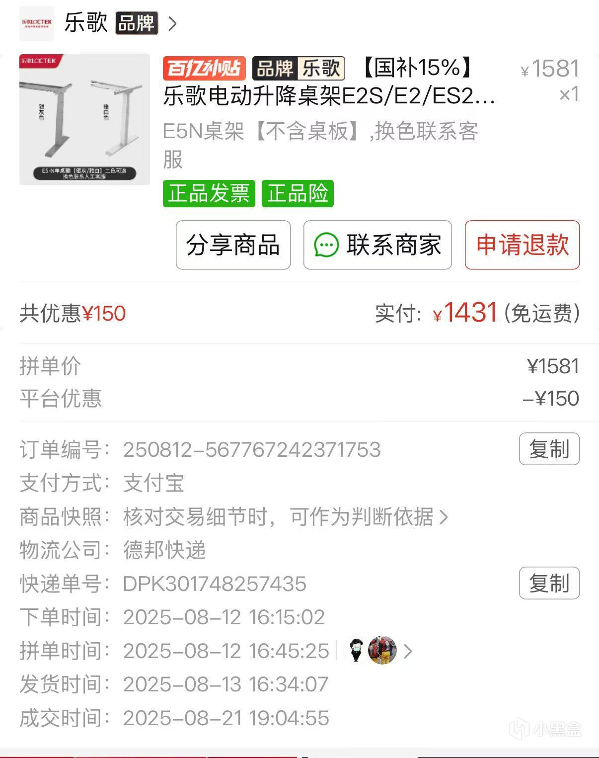 升降桌是半DIY的,桌面是打櫥櫃的時候的一起購買定製的,桌腿是在並夕夕上購買的樂歌E5N,是正裝雙電機三節的方管桌腿。購入的時候大約1400元左右。單獨購買桌腿不購買桌面的話,商家不提供安裝服務,所以整個桌腿和桌面都是主包自己安裝的,整體安裝也比較簡單,備好一把手槍鑽用來打自攻螺絲就好。