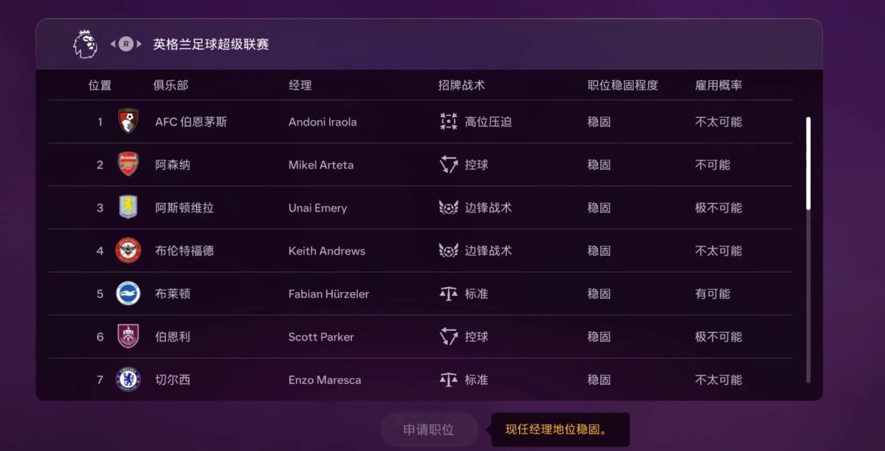 當某些球隊的教練職位空缺時我們可以進行申請,該俱樂部會根據近期戰績、戰術風格、國籍和聲譽來評估你的適應性。
