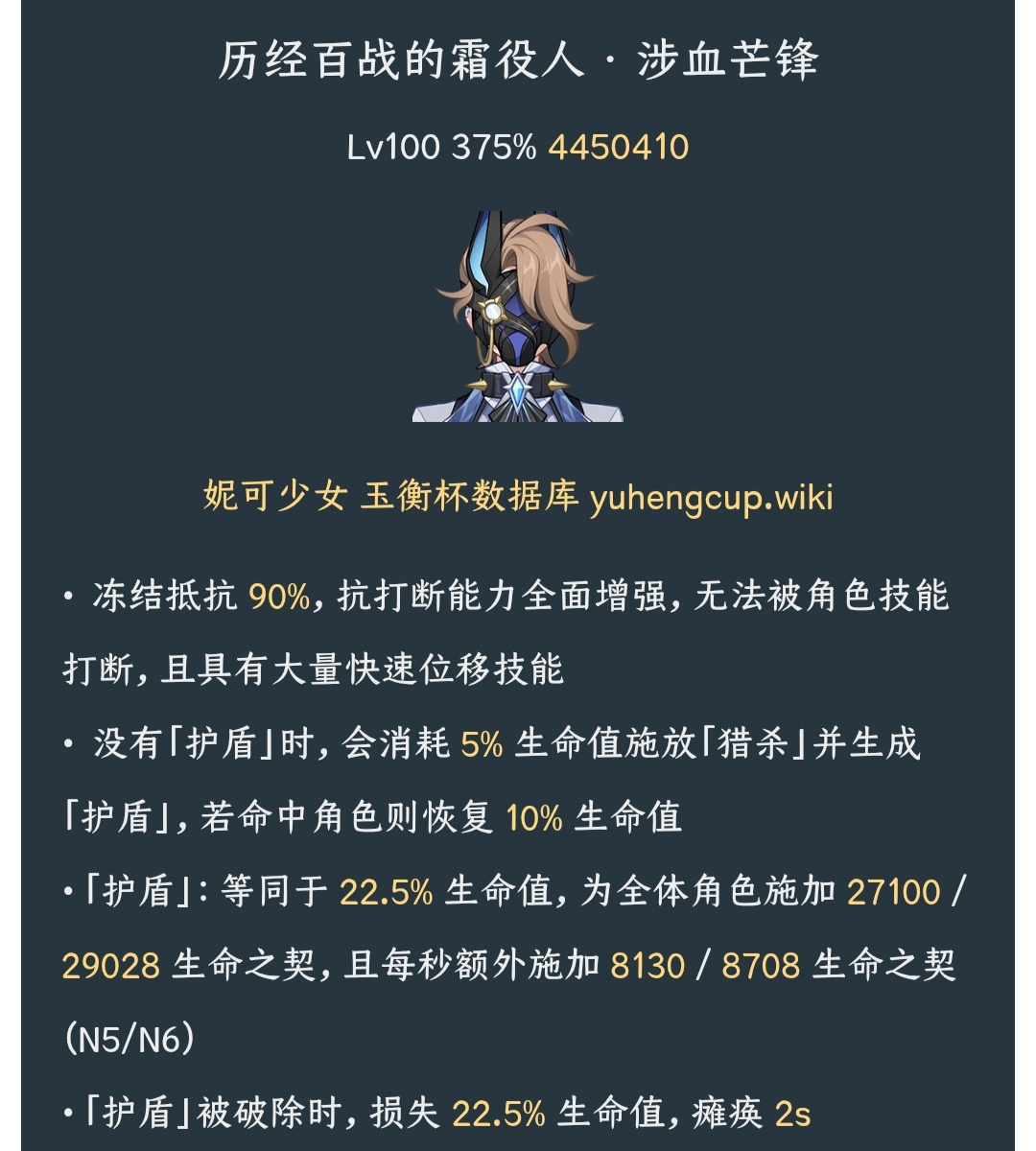 特性:高冻结抗性+免打断;消耗5%生命生成护盾,破盾后损失22.5%血量并瘫痪2秒;全场施加生命之契(持续增长)。