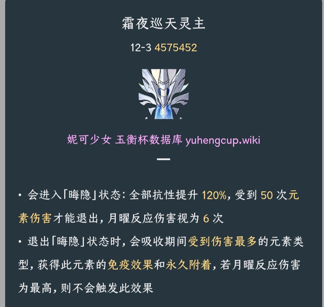 特性:晦隐状态全抗130%,受50次元素伤害后退出(月曜反应1次计6次);退出后免疫吸收最多的元素(月曜反应不触发)。
