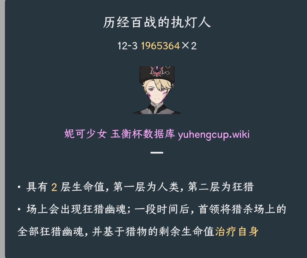 特性:双目标,高冻结抗性;血量归零或角色释放满辉技能后进入临界状态,需根据月兆等级(初辉/满辉)削减65%/90%生命上限才能击败,否则回满血。会吞噬场上的狂猎幽魂回血。