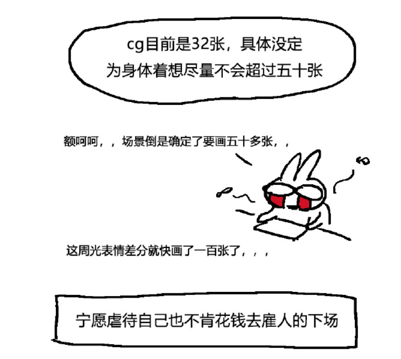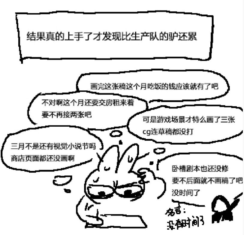 首先是时间和精力,她们一开始根本没想过做游戏会这么累。“真上手了才发现比生产队的驴还累”。本来想赶三月视觉小说节,但二月商店页面还没画,CG草稿都没打,“没有时间了”成为制作组的“名言”。
