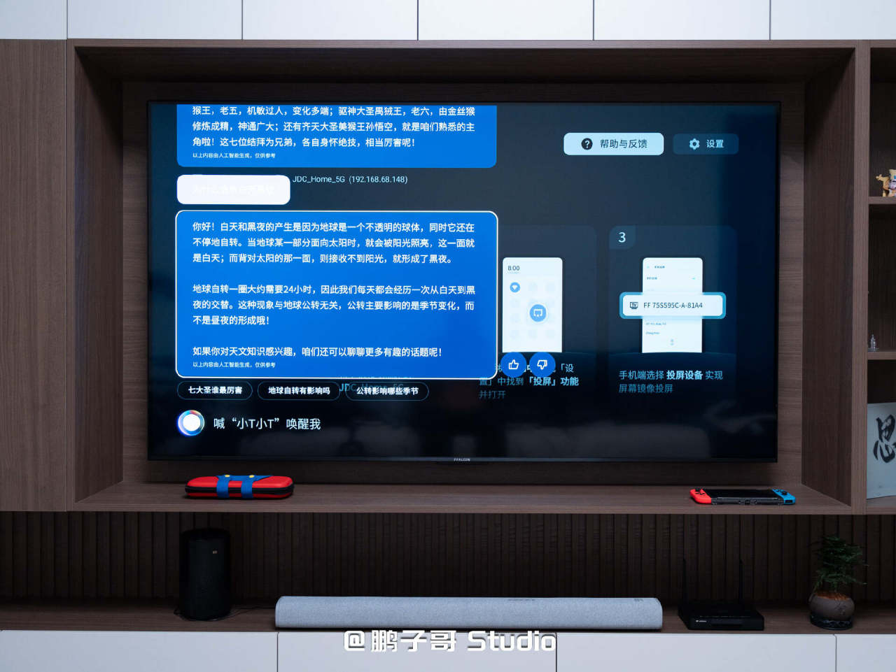 ▼系统还内置了伏羲AI大模型,通过「小T、小T」唤醒词轻松完成音量调节、搜索影片、AI问答等功能,终于不用忍受小爱同学的一问三不知了。