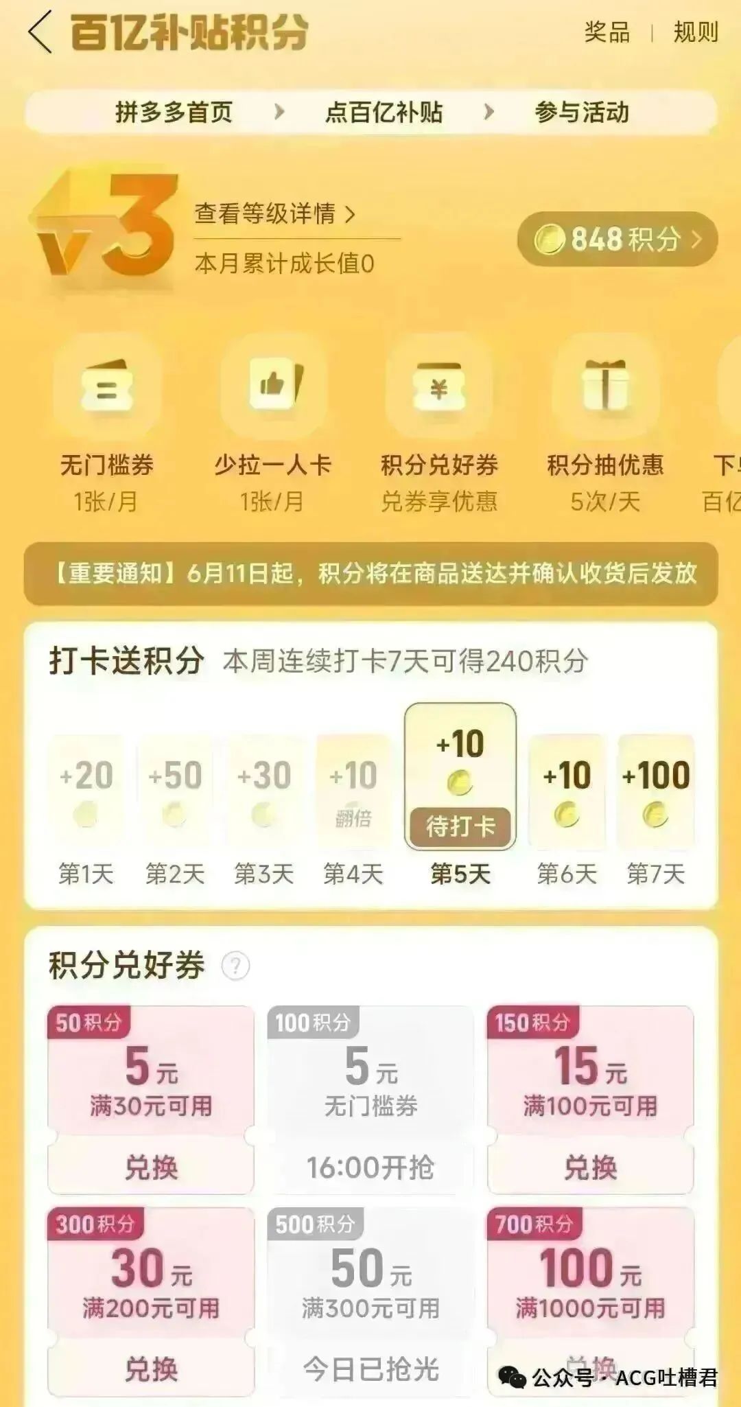 友情提示:如果有刷不出我這裏截圖價格的玩家,建議最近多刷刷百億補貼欄目,多搜索一下自己最近想要買的遊戲,實在不行換個新號試試,某多黑號是刷不到便宜價格的實體版遊戲,建議先養一下號。判斷是否黑號的方法很簡單,看看自己進百億補貼專頁裏,右上角有無積分,能否點進去兌換券,如果沒有積分肯定就是黑號了。此外V1用戶也可以每週連續打卡領240積分,攢着兌換一下券,買遊戲能便宜一點是一點,值得注意的是次月底會清空積分,能用就儘量先用,免得過期了。