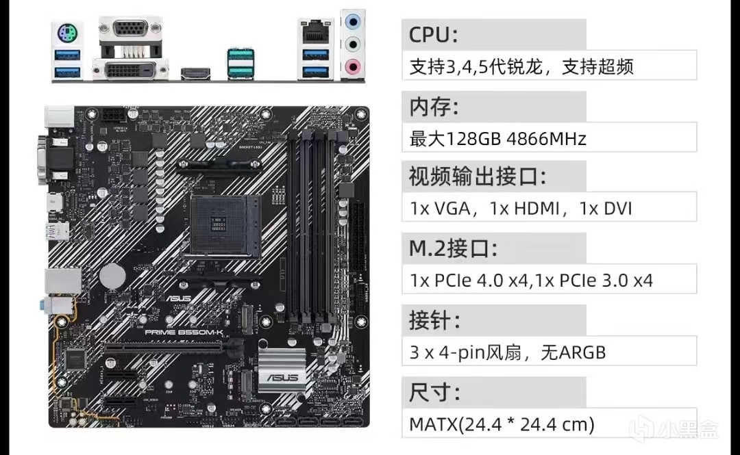 御三家入门级主板,买不了吃亏买不了上当,性价比还算不错,华硕的BIOS是我用过最舒服的,可以加50选择ARGB版本,低预算也能玩神光同步组台海景房,供电最高支持5700X3D,以后升级CPU也不用换主板,两个m.2固态硬盘位,不过需要注意一下第一个槽是4.0,第二槽是3.0,后续加装固态需要留意一下。