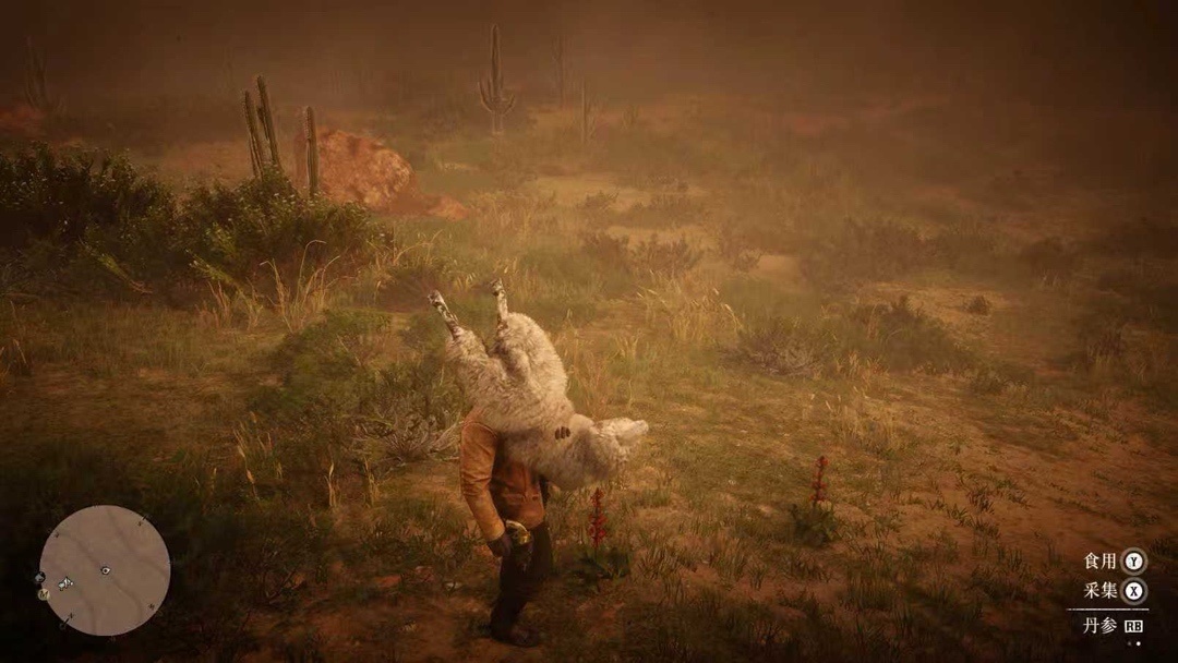 打中一只羊以后接着喝四瓶肯塔基波旁,在这期间被打中的羊一定会乱跑,我们只需要边喝酒边跟着它就行。这期间一定要跟着羊走,等它倒地了一定要站在它后面。