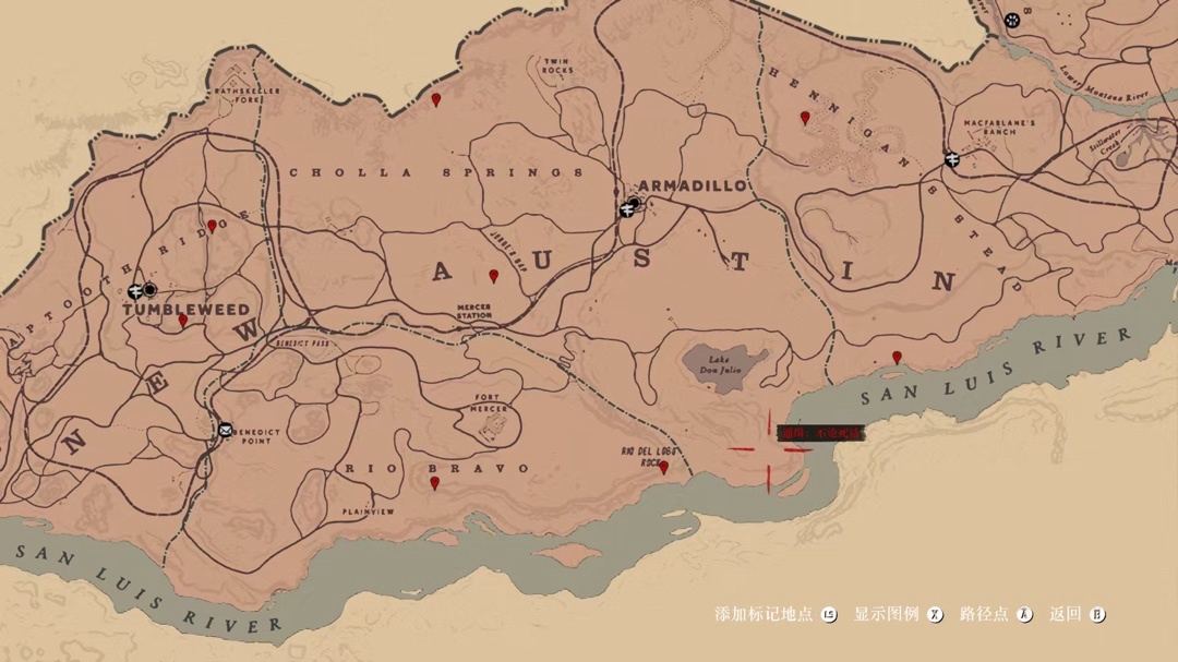注意:卡羊法是为了挡住新奥斯汀地区的黑枪,路过黑水镇时仍然会被大量警察追捕,请事先准备药品硬扛伤害