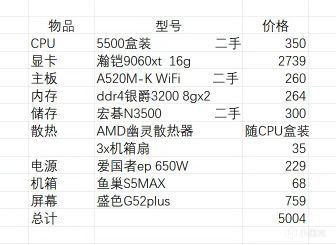我配的最极端的一台电脑是5500配的9060xt(主板后来品喜喜叠卷拿下全新,装了这么多台主板还是不敢用二手,硬盘是我换下来的还在保,问就是我想爆点米),我这个朋友的朋友完全不打网游FPS,装机便是为了玩高画质3A,未来如果想要玩模拟经营游戏,5500也可以很方便的升级。是的,极端,我知道他很极端。