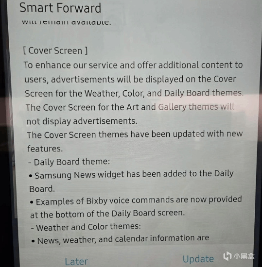 最先曝光这一消息的一位用户在社交媒体上分享了冰箱屏幕弹出的更新通知。通知显示,更新后天气、色彩和每日公告板这几个主题的封面屏幕都会出现广告,唯一能避开广告的方式是切换到艺术和画廊主题,这两个主题暂时保持无广告状态。