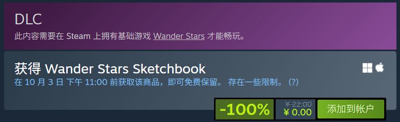 此遊戲還有一款原價22元的DLC:Wander Stars Sketchbook現在也限免,於北京時間10.03,23:00截止免費領取