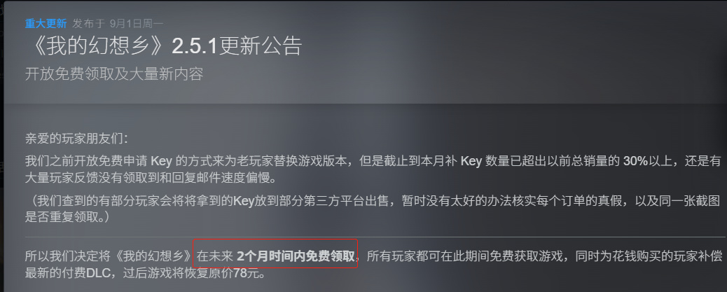 原價78元的《我的幻想鄉》,於北京時間9.01開啓爲期2個月的免費領取,預計於11.01截止免費領取