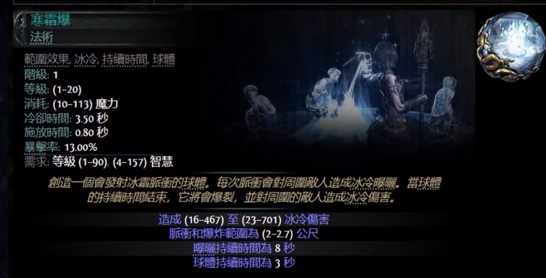 寒霜爆可以降低敌人的元素抗性并且减速,大大提升弓箭手的毒爆伤害和我们的生存。有多余的辅助宝石给寒霜爆上精准破坏